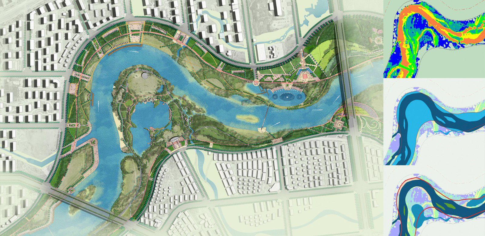 The natural riverway has been channelized in order to meet the flood safety regulation, which damaged the natural vegetation in the floodplain. The landscape team initiated a comprehensive strategy of recovering the original riverway and creating an extra lagoon, to meet the seasonal flood discharge demand.